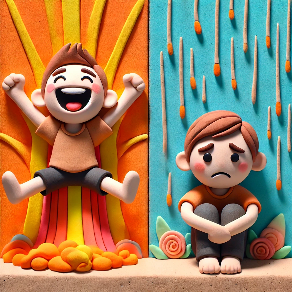 DALL·E 2025-03-03 17.52.33 – A claymation-style illustration featuring two characters representing emotional highs and lows. On the left, a joyful boy with short hair is jumping e